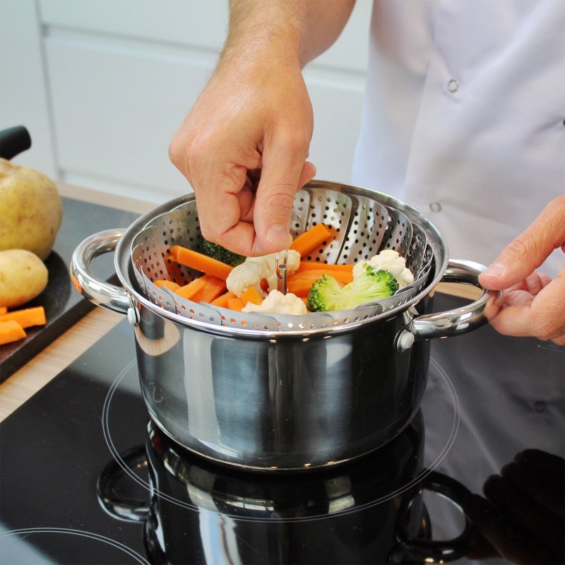 Μετατρέπει οποιαδήποτε κατσαρόλα 14 εκ. ή μεγαλύτερη σε ατμομάγειρα. Λειτουργεί καλύτερα με κατσαρόλες με καπάκι διαμέτρου περίπου 20 εκ. Απλώς ανοίξτε και τοποθετήστε το μέσα με 2,5 εκ. νερό. Αφήστε να πάρει βράση, προσθέστε μια στρώση λαχανικών στο καλάθι και κλείστε το καπάκι για να κρατηθεί ο ατμός. Αναλόγως τον τύπο των λαχανικών θα χρειαστείτε 5 με 10 λεπτά για να ετοιμαστούν.