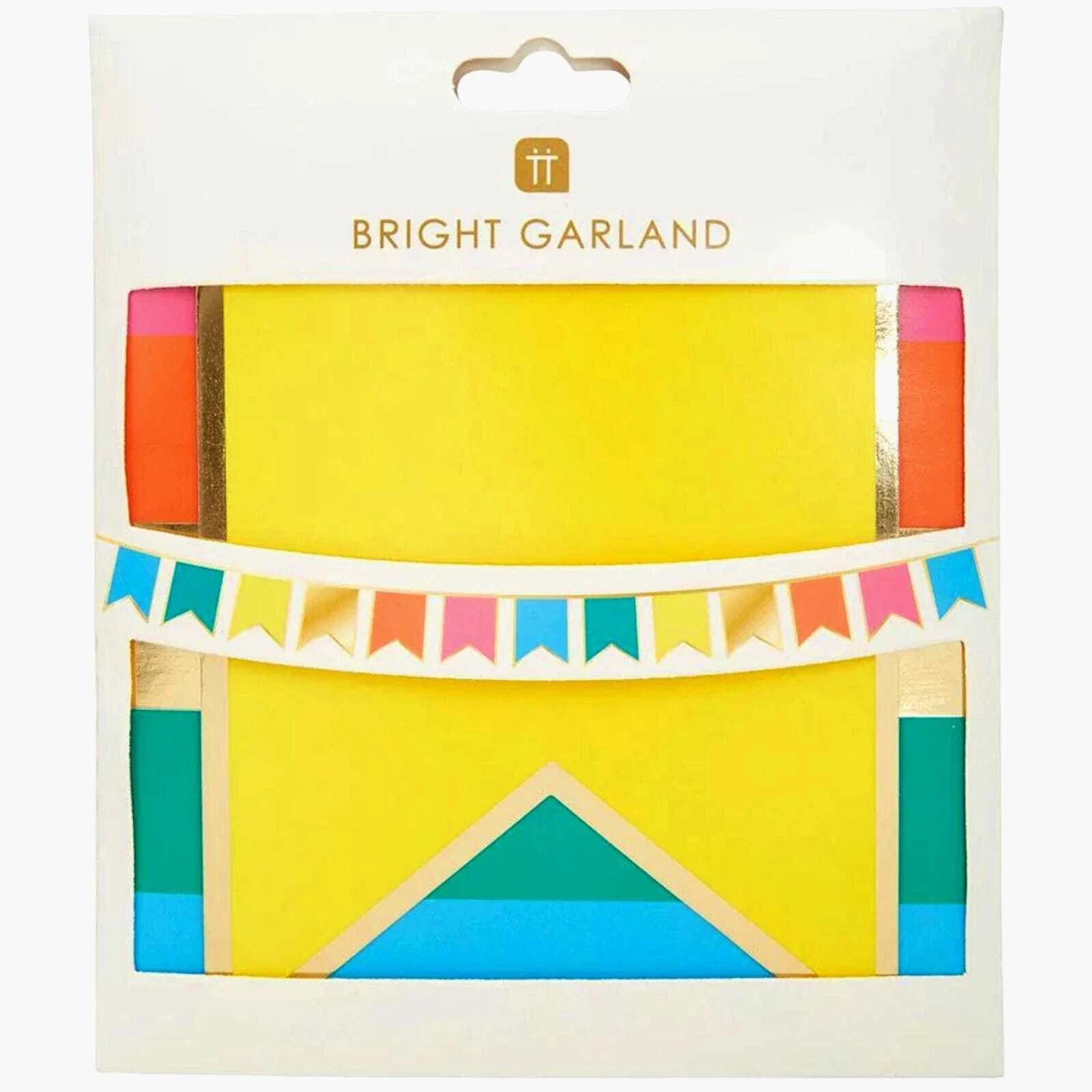 Γιρλάντα με χάρτινες σημαιούλες της εταιρείας Talking Tables, δεμένες σε χρυσή κορδέλα τριών μέτρων με χρυσό τελείωμα για περισσότερη λάμψη στην εορταστική διακόσμηση. Με 6 διαφορετικά χρώματα, ιδανική για να διακοσμήσετε τις κουρτίνες σας, τα παράθυρα ή να γεμίσετε έναν χώρο στο πάρτι σας που χρειάζεται λίγο επιπλέον χρώμα, εμπνευσμένο από το ουράνιο τόξο!