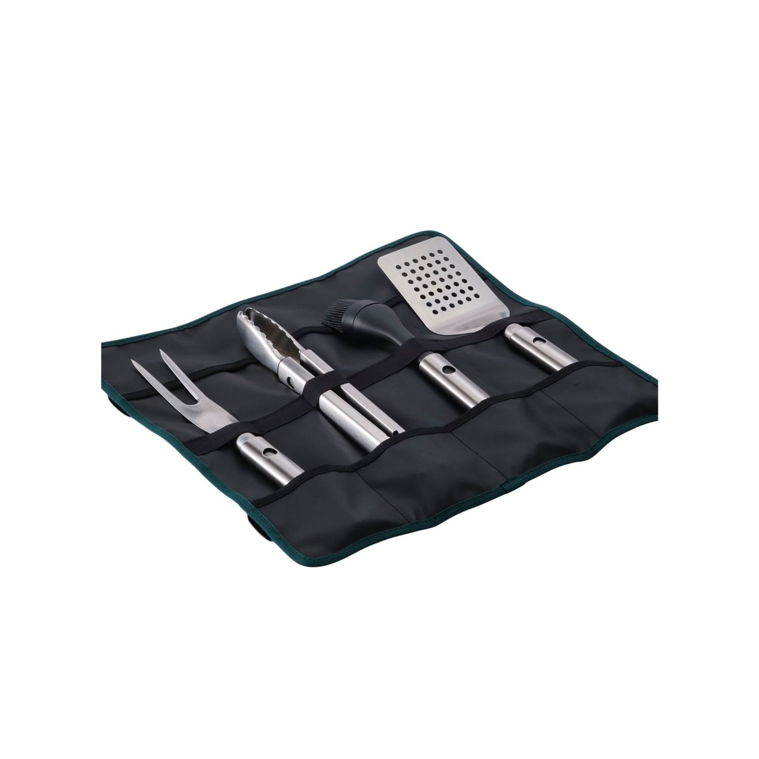 Ολοκληρώστε τον εξοπλισμό της ψησταριάς σας με αυτό το σετ 4 εργαλείων, που περιλαμβάνει πινέλο για μαρινάδες, λαβίδα, σπάτουλα και πιρούνι, καθώς και πτυσσόμενη θήκη για ασφαλή αποθήκευση και εύκολη μεταφορά.
