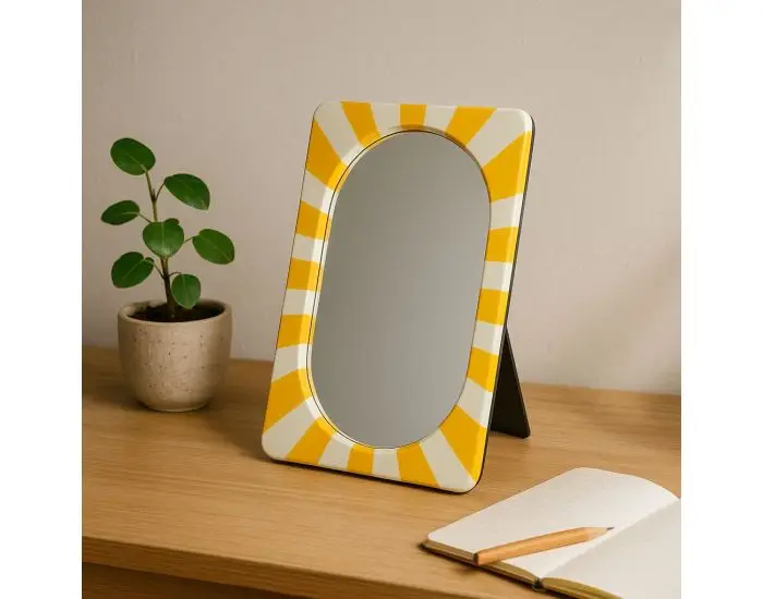 Δώστε μια νέα πνοή στη διακόσμηση του σπιτιού σας με αυτόν τον εντυπωσιακό κίτρινο-λευκό καθρέφτη που φωτίζει αμέσως κάθε χώρο. Αυτός ο καθρέφτης με κεραμικό σκελετό φέρνει μια δροσερή ενέργεια στο δωμάτιο, οι κυματιστές ρίγες του προσθέτουν τολμηρό, μοντέρνο χαρακτήρα και δίνουν στο κομμάτι μια εντυπωσιακή παρουσία, που τραβάει τα βλέμματα τη στιγμή που μπαίνεις μέσα. Τονίζει με την παρουσία του το δωμάτιο, ενεργώντας ως ένα ισχυρό σημείο εστίασης που αναδεικνύει τη γύρω διακόσμηση.