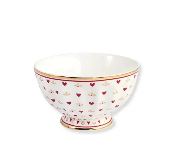 Τα γαλλικά μπολ από πορσελάνη της GreenGate, διαμορφώνονται με γνώμονα την κομψότητα και την καθημερινή χρήση. Το Layla Heart Petit είναι ένα ρομαντικό και απολαυστικό  μοτίβο σαν κέντημα που θα σας κλέψει την καρδιά με το γοητευτικό του σχέδιο. Οι όμορφες λεπτομέρειες, συνυφασμένες με γοητευτικές καρδιές, προσδίδουν σε αυτό το σχέδιο μια πινελιά κομψότητας και ιδιαιτερότητας σε κάθε χώρο. Ο συνδυασμός της σειράς Layla Heart Petit με την σειρά Alice και τα χρώματα stone grey και claret red, δημιουργεί μια ζεστή ατμόσφαιρα, όπου το λεπτό σαν κέντημα μοτίβο έρχεται σε όμορφη αντίθεση με τους τόνους του γκρι και του κόκκινου.