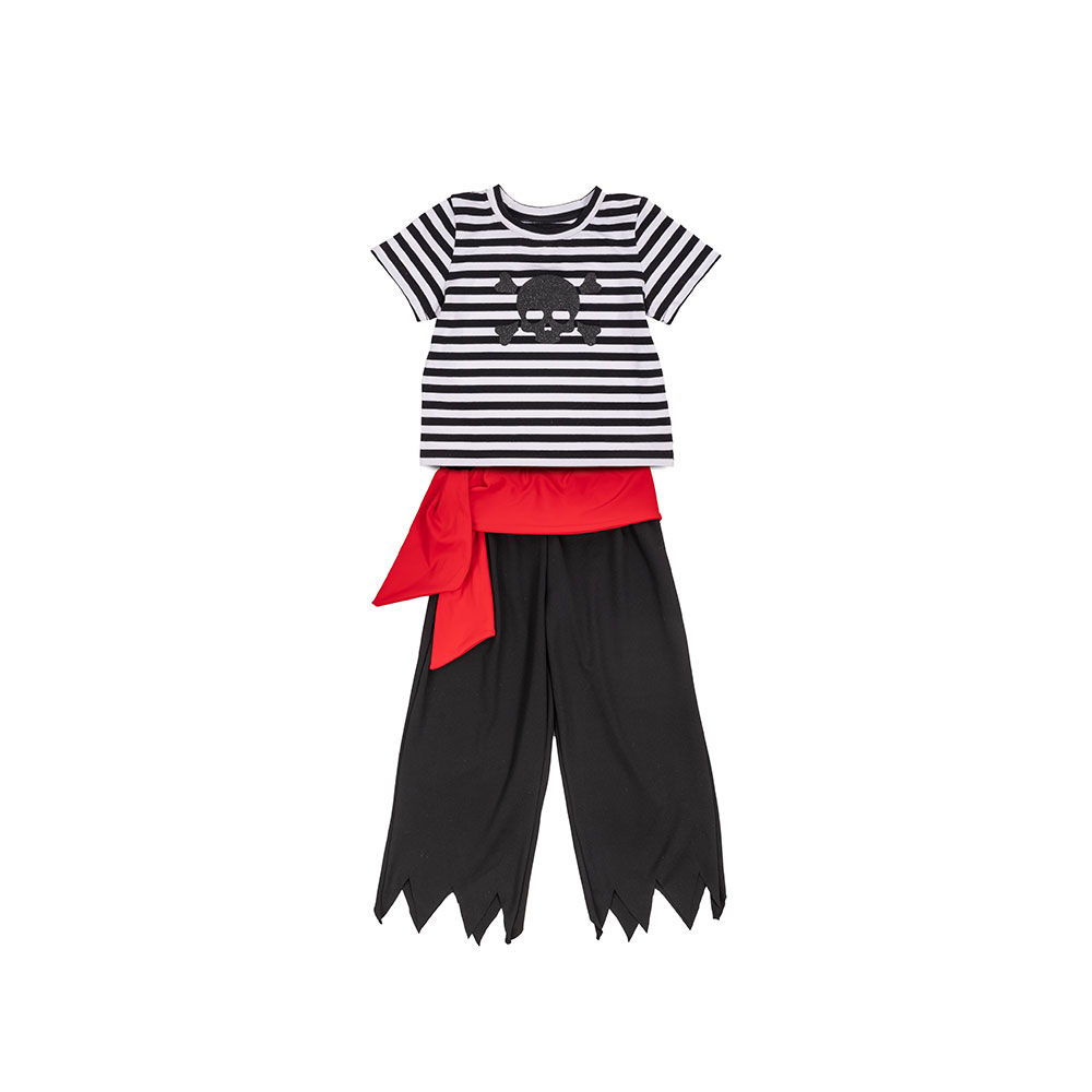 Το επάνω μέρος του ξεχωρίζει με τις κλασικές μαύρες και λευκές ρίγες και το εντυπωσιακό έμβλημα με νεκροκεφαλή στο κέντρο, αποδίδοντας αυθεντικό πειρατικό χαρακτήρα. Το μαύρο παντελόνι με το ακανόνιστο τελείωμα ενισχύει την αίσθηση περιπέτειας, θυμίζοντας εμφάνιση «μόλις βγήκε από το πειρατικό καράβι». Η κόκκινη ζώνη που δένεται στη μέση ολοκληρώνει τη στολή, προσθέτοντας έντονη χρωματική αντίθεση και δυναμικό στυλ. Χρησιμοποιείται σε αποκριάτικες εμφανίσεις, παιχνίδι ρόλων, θεματικά πάρτι ή καθημερινό παιχνίδι φαντασίας. Ενισχύει τη δημιουργικότητα, την αφήγηση ιστοριών και το ενεργητικό παιχνίδι, αποτελώντας μια ολοκληρωμένη και ποιοτική επιλογή για μικρούς λάτρεις των πειρατικών περιπετειών.