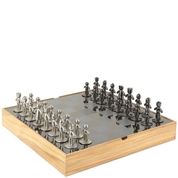 Το Buddy Chess είναι μια πρωτότυπη, όσο και εντυπωσιακή απεικόνιση του πλέον δημοφιλούς επιτραπέζιου παιχνιδιού στρατηγικής. Σχεδιασμένο από τους Alan Wisniewwski και Wesley Chau, το σκάκι της Umbra αποτελεί επίσης ένα κομψό αντικείμενο για κάθε χώρο, ένα δυναμικό αντικείμενο διακόσμησης, ακόμα και όταν δεν χρησιμοποιείται. Διαθέτει πολυτελή βάση από μασίφ ξύλο, η οποία φιλοξενεί σε ειδικές θήκες τους 32 πεσσούς (πιόνια), ενώ το στιβαρό καπάκι από πλάκα μετάλλου με επίστρωση τιτανίου χρησιμεύει ως σκακιέρα. Οι πεσσοί αποτελούν παραλλαγή της αντιπροσωπευτικής για την Umbra ανθρώπινης φιγούρας Buddy και είναι χυτευμένοι από κράμα μετάλλου με εξαιρετικό -σατινέ και μαύρο στιλπνό- φινίρισμα, ενώ διαθέτουν βελούδινη επένδυση, η οποία ενισχύει την αίσθηση πολυτέλειας την ώρα του παιχνιδιού. Δωρίστε στον εαυτό σας ή σε ένα αγαπημένο πρόσωπο ένα καθημερινό μοναδικό αντικείμενο και παιχνίδι και απολαύστε ατέλειωτες ώρες πνευματικής ενασχόλησης.