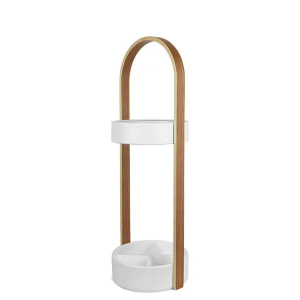 Η ομπρελοθήκη Bellwood αποτελεί ένα καθημερινό μοναδικό αντικείμενο για κάθε σπίτι ή επαγγελματικό χώρο. Με υψηλή ποιότητα κατασκευής και μεγάλη πρακτικότητα, η Bellwood ξεχωρίζει και διακοσμεί τον χώρο σας με την κομψή γραμμή και το μινιμαλιστικό design. Ο μασίφ ξύλινος σκελετός, ο οποίος δημιουργεί την λαβή μεταφοράς, αποπνέει μια μοναδική αίσθηση πολυτέλειας. Το μεταλλικό στεφάνι συγκρατεί τις μεγάλες ομπρέλες, ενώ οι μικρές αναδιπλούμενες μπορούν να κρεμαστούν στα ενσωματωμένα άγκιστρα που διαθέτει. Η βαριά βάση από συνθετική αδιάβροχη ρητίνη, συγκεντρώνει τα νερά και κρατάει σταθερή την ομπρελοθήκη, χωρίς να τραυματίζει τις επιφάνειες, χάριν στα αντιολισθητικά προστατευτικά βύσματα που διαθέτει.