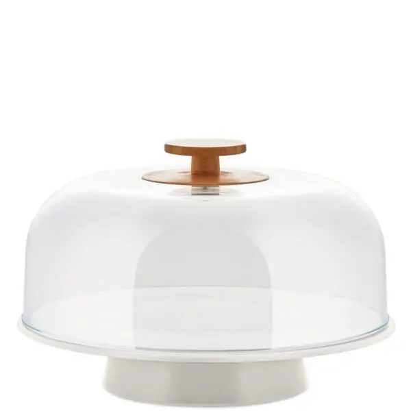 Βάση για κέικ Mattina της Alessi από εξαιρετικής ποιότητας πορσελάνη με ακρυλικό καπάκι και λαβή από ξύλο bamboo.