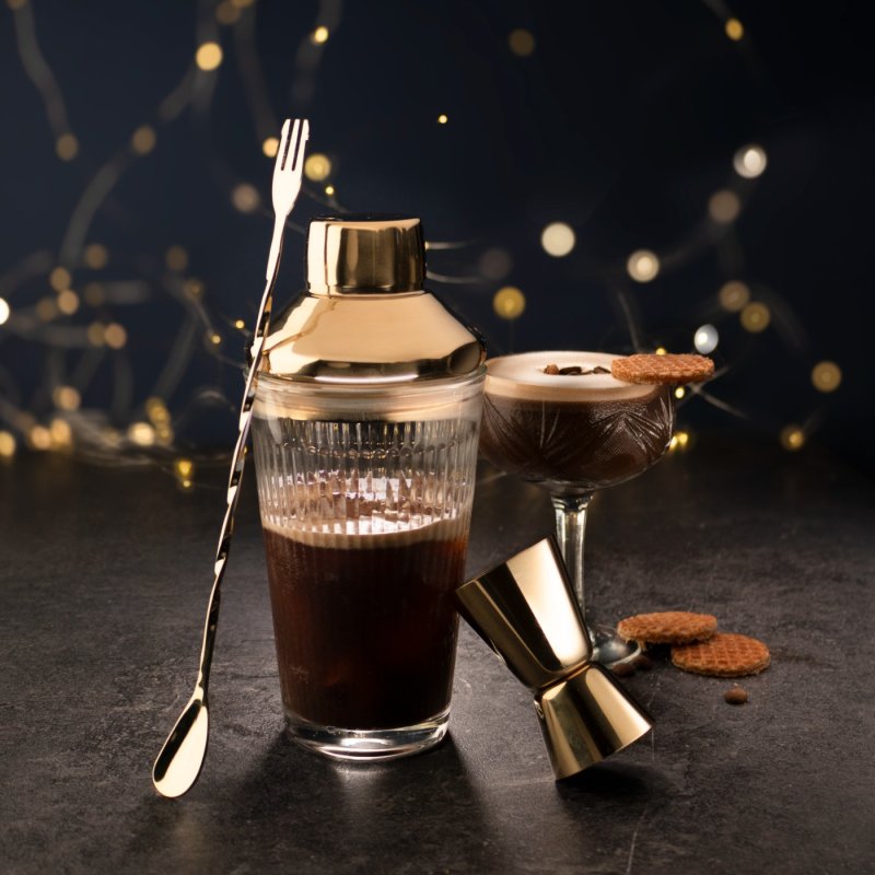 Διοχετεύστε το πνεύμα ενός μπάρμαν της εποχής της Jazz και αναβαθμίστε την mixology agenda σας με αυτό το εκλεπτυσμένο σετ τριών τεμαχίων για coctails. Ο σχεδιασμός με ραβδώσεις στο γυαλί και το αστραφτερό χρυσό καπάκι από ανοξείδωτο ατσάλι αποπνέουν μια εκλεπτυσμένη vintage εικόνα. Αυτό το σετ αποπνέει την κομψότητα που θυμίζει τη βρυχηθή δεκαετία του ’20. Γυάλινο shaker “Cobbler” με καπάκι σε χρυσό χρώμα από ανοξείδωτο ατσάλι, συν double jigger & κουτάλι ανάμειξης.