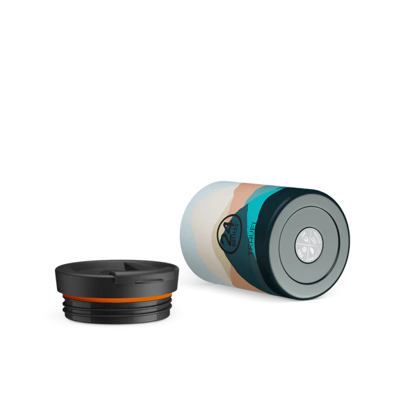 Ισοθερμική κούπα ταξιδιού Travel Tumbler της εταιρείας 24Bottles® σε απόχρωση πολλών διαφορετικών χρωμάτων που θυμίζουν εικόνα οροσειράς στον ορίζοντα, ενώ το αδρό φινίρισμα της σφυρήλατης βαφής χαρίζει μεγαλύτερη αντοχή και αίσθηση που θυμίζει σκληρά πετρώματα.
